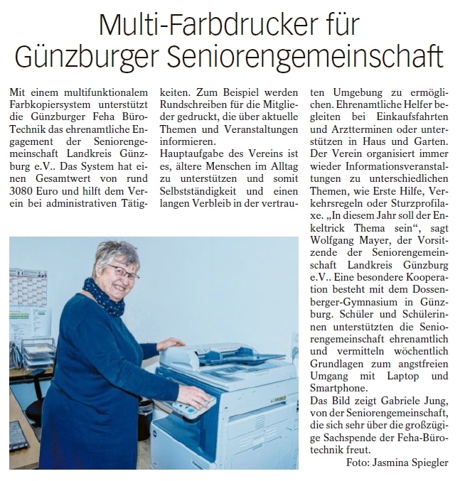 Die Günzburger Firma Feha Büro-Technik unterstützt unser ehrenamtliches Engagement mit einem multifunktionalen Farbkopiersystem im Wert ca. 3080 Euro, das keine Wünsche offen lässt. Wir bedanken uns recht herzlich bei der Firma Feha Büro-Technik!