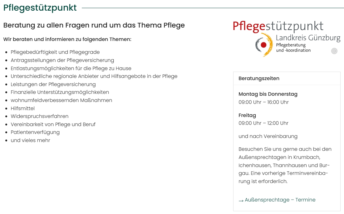 Der Pflegestützpunkt Günzburg ist bbeim Landratsamt Günzburg angeschlossen. Nähere Infos wie Ansprechpartner, Kontaktdaten und Terminvereinbarung finden Sie auf dieser Homepage. Die Beratung wird telefonisch, im Pflegestützpunkt, als Hausbesuch, bei Außensprechtagen oder auch per Videoberatung angeboten.